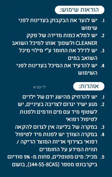 יש לדלל כ-2 פקקים בדלי מים (4-5 ליטר) ולנקות כרגיל.